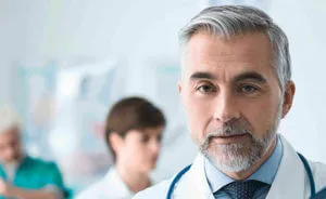 Porträtaufnahme eines Chefarztes mit Mitarbeitern im Hintergrund.